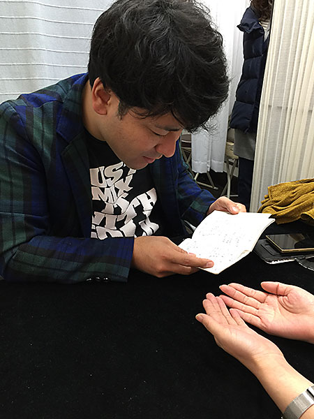 みのるチャチャチャ♪先生 @tachibanasans の手相鑑定を受けるミズマチユミコ先生 @mizumachiyumiko の図。ユミコ先生の秘密が、手相からズバズバと読み解かれていました♪ pic.twitter.com/UHNiGGLzhL