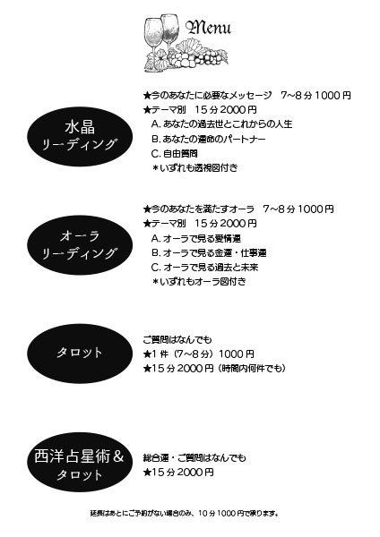 ほかは割とまんべんなくオーダーをいただいたのですが、私の一押しだったオーラリーディングを受けてくださった猛者は、おふたりだけでした。