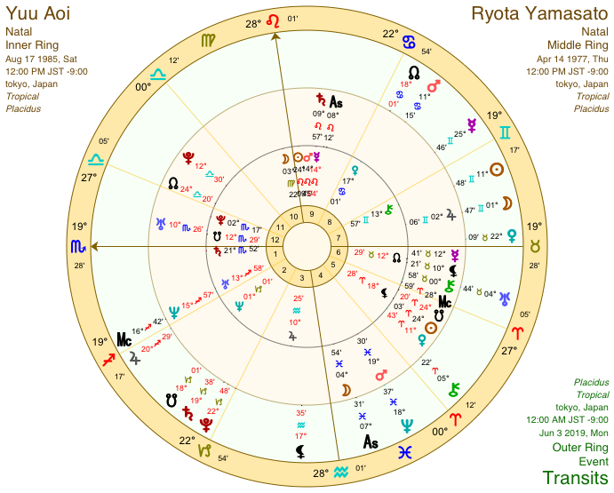蒼井さんのほうのタイミングとしては、ネイタルの太陽に射手木星がトライン、プログレスの月が射手で、ネイタルの太陽にトライン…と、教科書通り! みたいな形です。