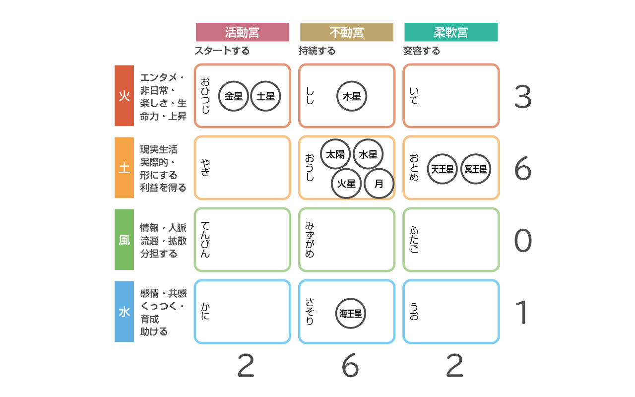 この図はみずまちの3区分4元素です。縦ラインが3区分(クオリティ)、横ラインが4元素(エレメンツ)ですよ。