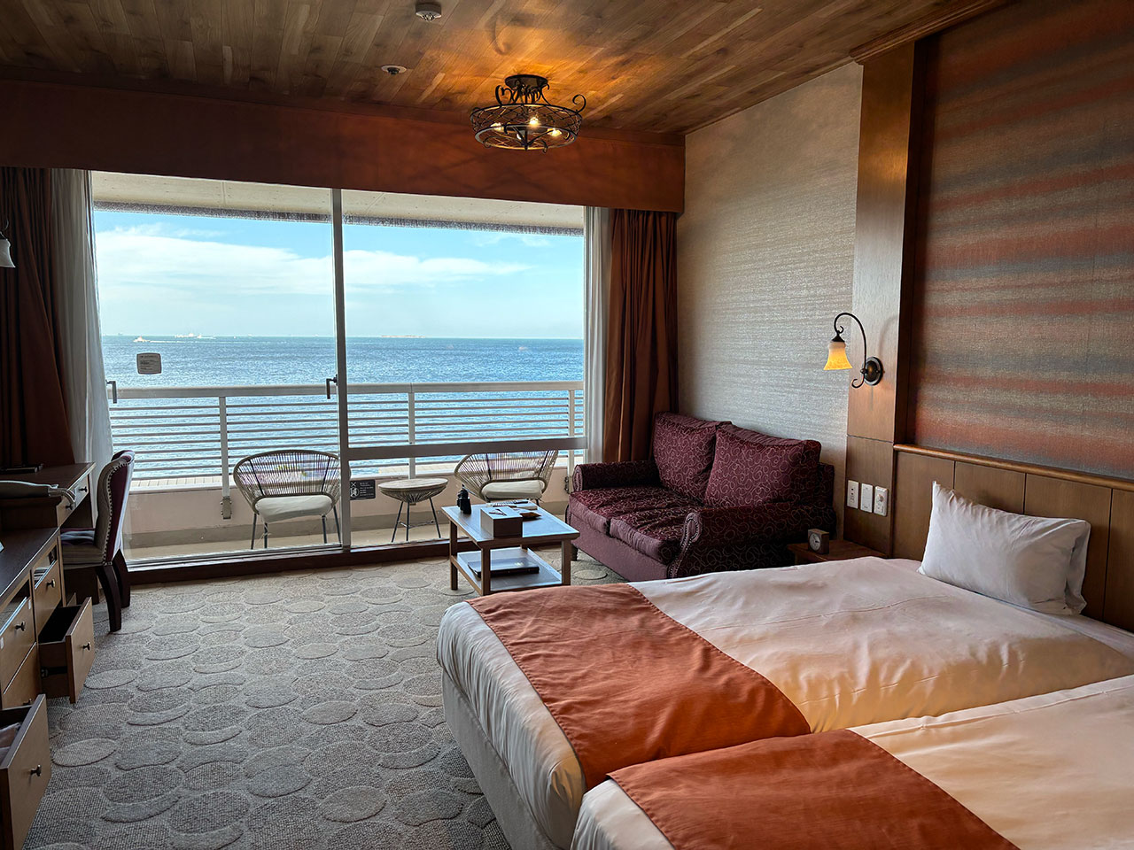 リゾートホテルなのでひとりで泊まるとお高いのですが、今回は「海を眺めつつホテルでのんびり、温泉でまったり」がテーマなので、オーシャンビューなお部屋に早めにチェックイン、遅めにチェックアウト、夜はフルコース、朝はビュッフェの2食つき! というリッチなプラン。