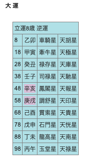 上の「運命式の算出」で出すと大運というのが出てきます。10年ごとの運勢です。