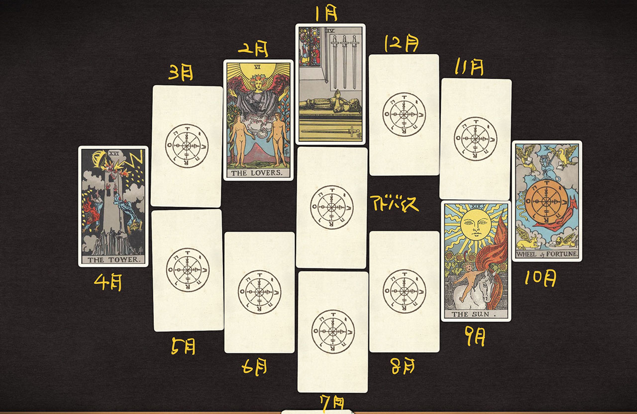 4月のタワー正位置から始まって、大アルカナ正位置が5枚も出て、賑やかそうな1年です……。