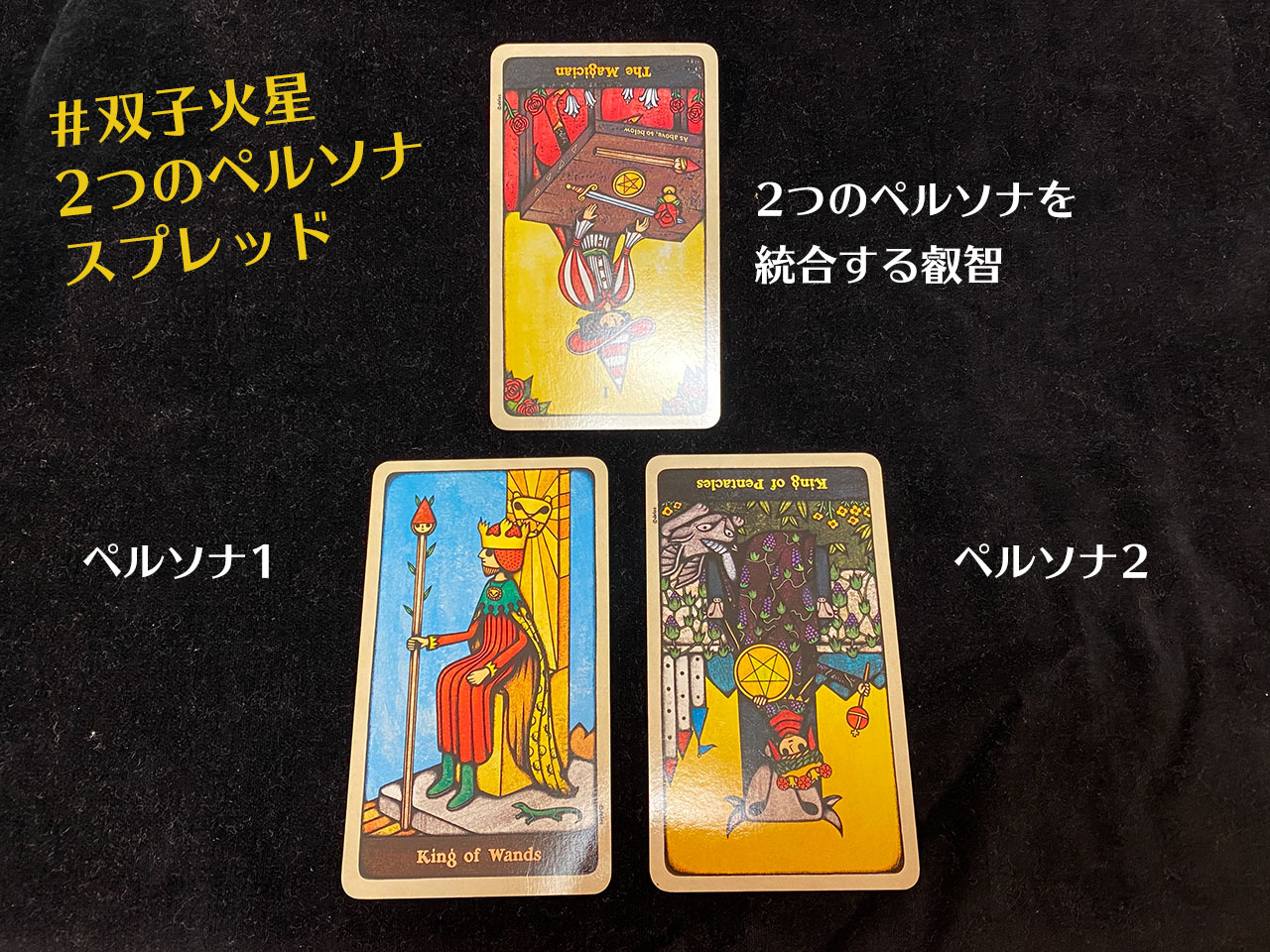 ペルソナ1、2はワンドのキングとペンタクルスのキングの逆位置です。 ワンドのキングは先頭を切って遊んだりクリエイティビティを楽しんだりせよということですね。 楽しんでることをみなさんに見せるのも大事なのだと思います。 牡羊木星期間でもあるので(魚木星に戻る期間もあるけども)堅苦しいのはダメですね。 ペンタクルスのキング逆位置は、キャリアやステータスを隠しておけかなというふうに見ました。 偉そうに振る舞わないとか、できる人として振る舞わないとか。 ビジネスっぽさを出さないことがいいようです。 使う場面は特に想定しませんでしたが、占いの仕事がワンドのキング、デザインの仕事がペンタクルスのキング逆かなと感じました。 「2つのペルソナを統合する叡智」は奇術師の逆位置。 解釈を少し悩みましたがペルソナ1、2との組み合わせを考えると、「なんでも軽々しくやらない、引き受けない」でも「準備もしすぎない」あたりでしょうか。 個人的には6ハウスを火星が回るので、引き受けすぎて潰れそうに感じたので「やりすぎない」「自分が主導権を握る(キングなので)」を大事にしようと思いました。 今回のスプレッドはカードを分けないといけないのでちょっと面倒臭いですが、練習がてらやってみてくださいね。 ハッシュタグはこれで! #双子火星2つのペルソナスプレッド