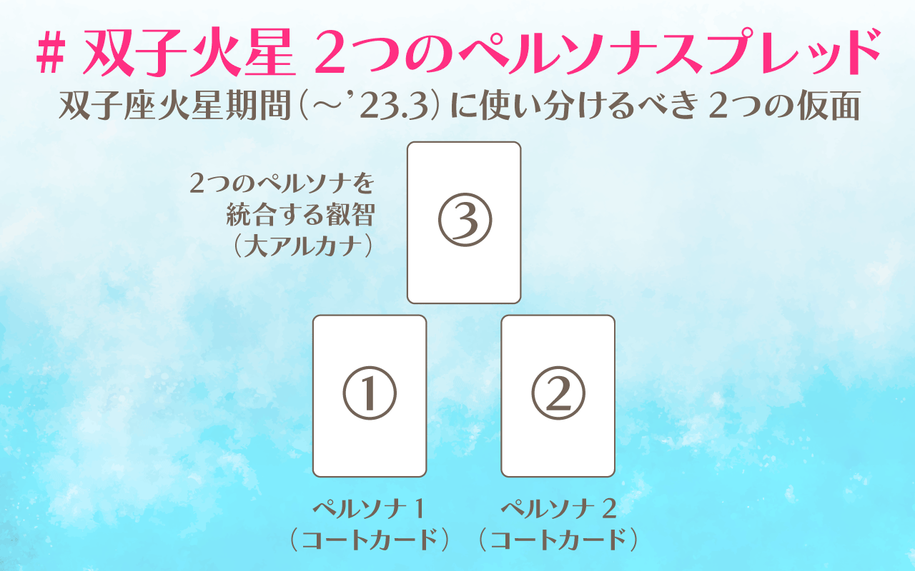 今回の火星は逆行もあるため長期間双子座に滞在します。 来年2023年3月25日まで、半年以上ありますね。 こちらの記事では12サイン別マルチタスクを書きましたが、スプレッドは2つの仮面を被って使い分けることをテーマに考えてみました。双子火星2つのペルソナスプレッド