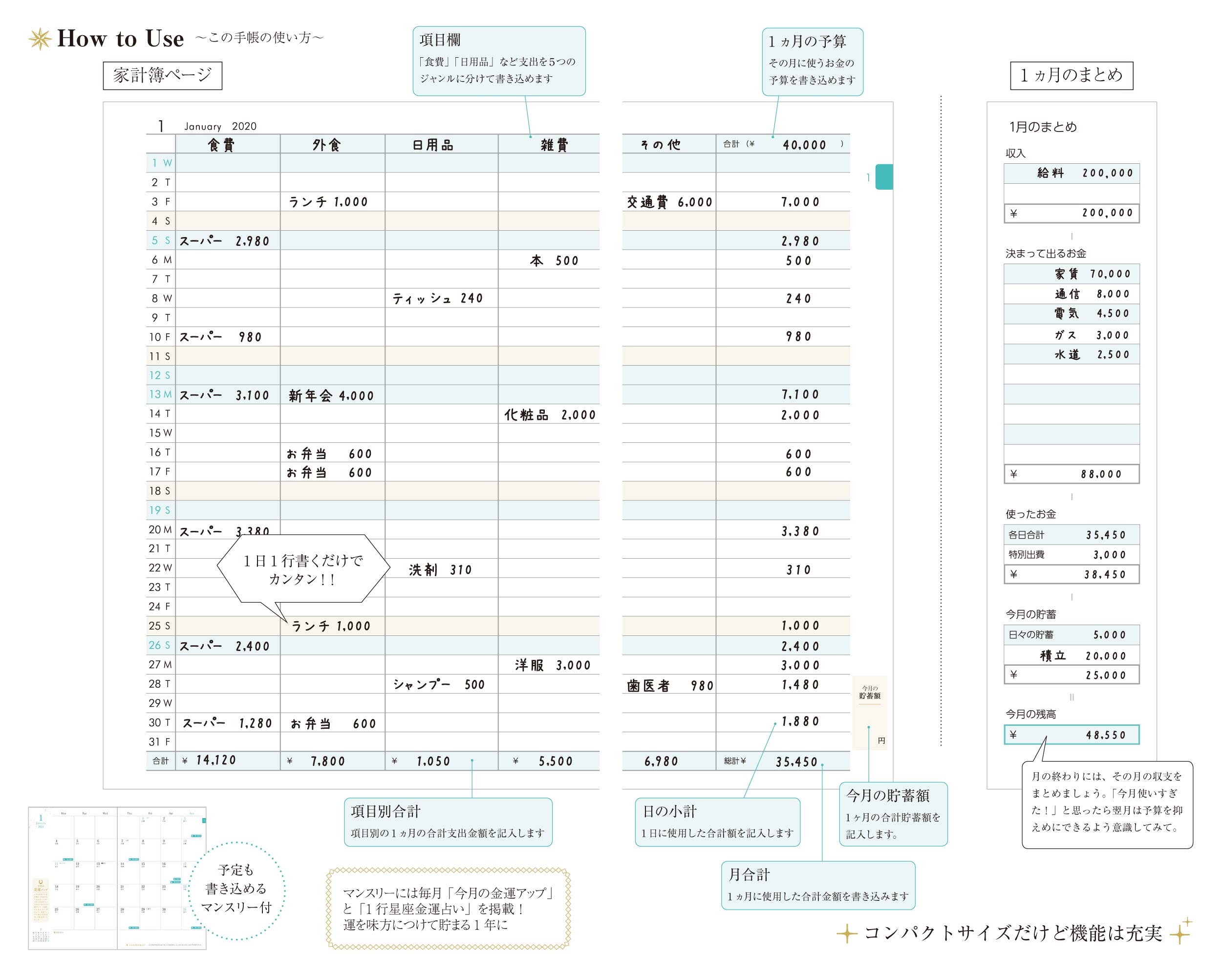 月曜始まりのマンスリータイプのスケジュールと、タイトルの通り1日1行支出を記入できるページ、毎月のまとめページがあります。