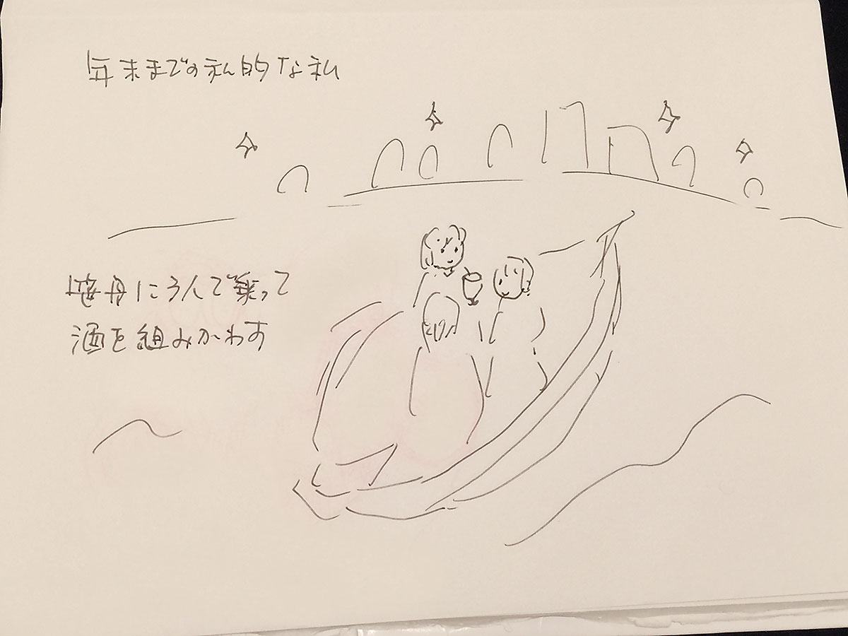 笹で作る笹舟のような、大きな葉っぱで作った船に3人乗っていて、のんびりお酒を飲んでいる。