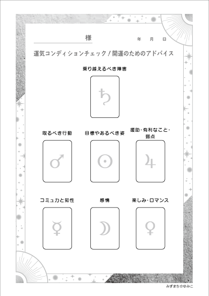 当座の目標が特にない、悩みもないという人向けにアレンジした「運気コンディションチェック!開運のためのアドバイス」というイベントメニューです。